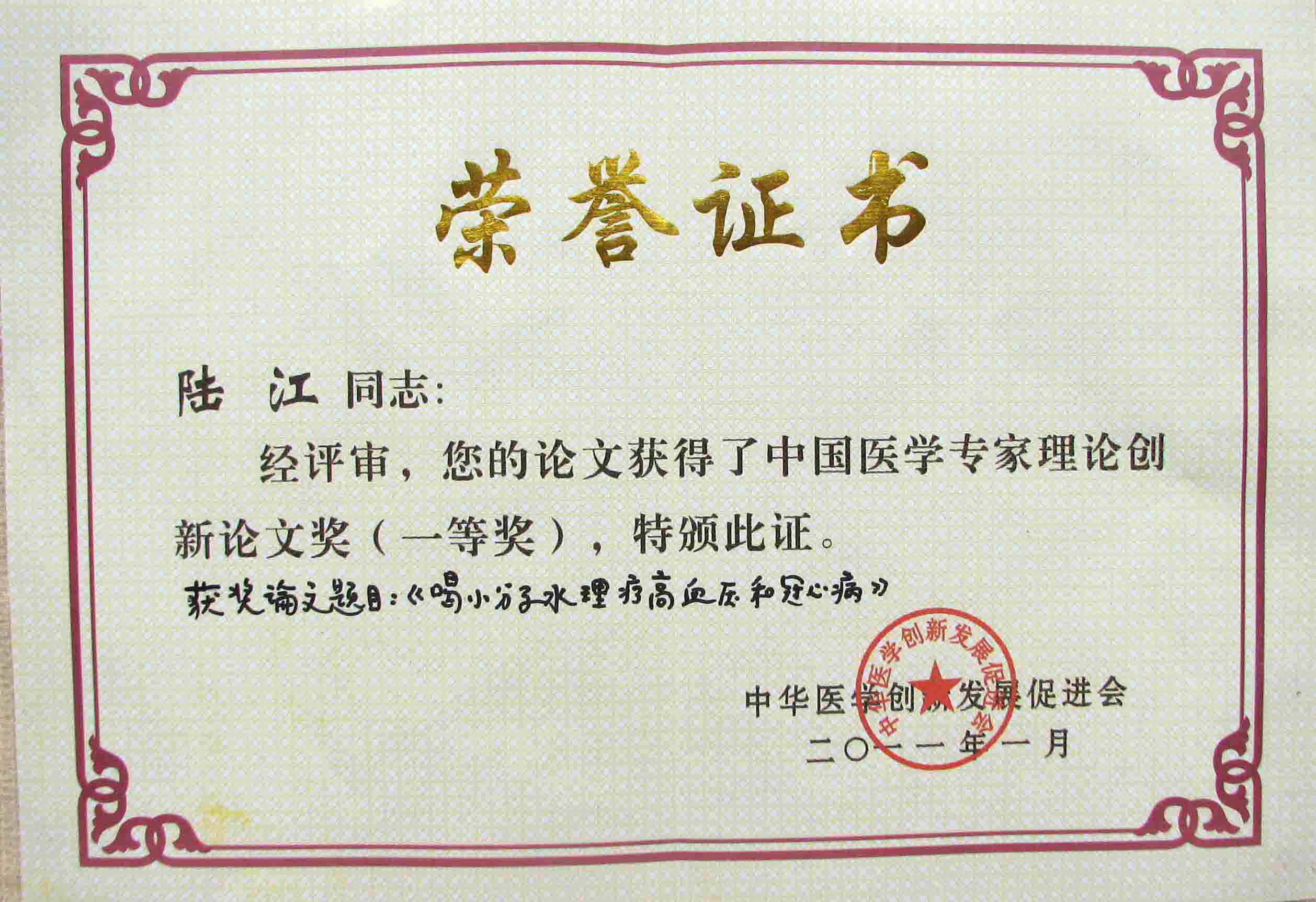 新疆63歲的賀兆生飲用一年,冠心病未愈,他用電話介紹是食堂管理員,問(wèn)他食量多少?說(shuō)吃七八分飽,睡前還吃兩袋牛奶,陸 江說(shuō)我在論文和書中多次批判“吃七八分飽”,關(guān)照患者務(wù)必用“己饑方食”控制主食肉食量,要他把牛奶改在早中餐吃,減少主食肉食量,建議不吃晩餐,晚上只吃一個(gè)蘋果,再經(jīng)幾個(gè)月補(bǔ)水節(jié)食,治愈了21年的冠心病和肥胖、失眠等病,信中由衷地感激陸 江為再生父母。[13]因?yàn)獒t(yī)生從未過(guò)問(wèn)他的膳食習(xí)慣,只管開(kāi)處方藥或手術(shù),父母也不會(huì)叫他不吃晩飯。