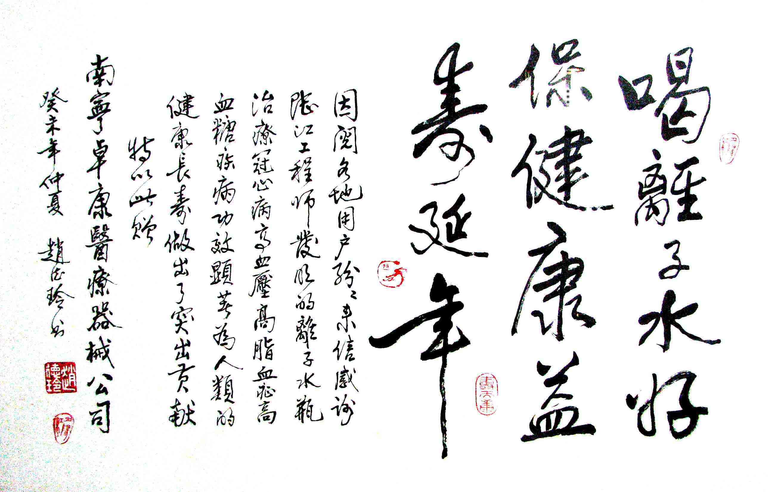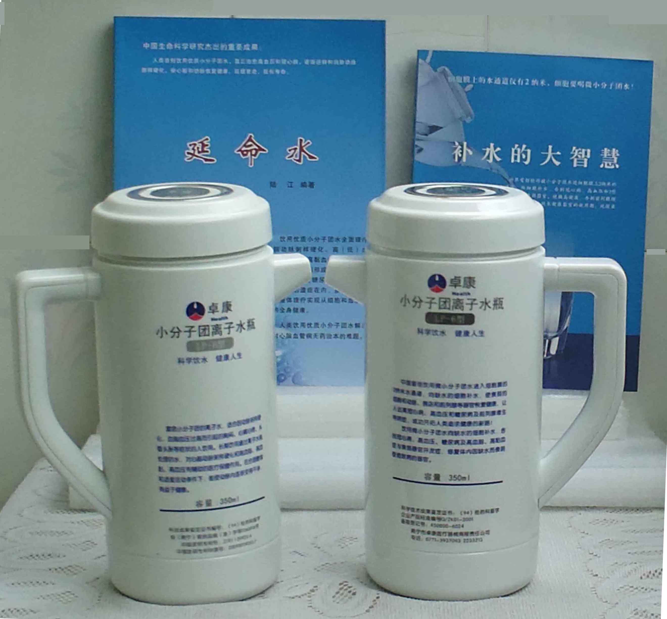 本品大量用戶的使用效果表明,能治愈冠心病、腦動(dòng)脈硬化、原發(fā)性高(低)血壓、高血脂、高粘血癥、高血尿酸癥(痛風(fēng))和2型糖尿病、衰弱器官并發(fā)癥(前列腺增生、腎衰與尿毒癥)及中風(fēng)后遺癥等療效好。產(chǎn)品配信譽(yù)卡。使用壽命30年,不換芯,易清洗。團(tuán)購(gòu)優(yōu)惠。從郵局匯款,匯費(fèi)1%,地址按本頁(yè)下方地址、聯(lián)系人寫。從銀行匯款,請(qǐng)點(diǎn)擊[聯(lián)系匯款]欄,從工商銀行匯款,建設(shè)銀行、農(nóng)業(yè)銀行匯款,均免收匯費(fèi),匯款后20--30分鐘內(nèi)發(fā)短信,可用微信轉(zhuǎn)帳,均免匯費(fèi),微信號(hào)即手機(jī)號(hào)13768308380。匯款后,告知你的姓名和地址,我公司聯(lián)系人手機(jī)號(hào)是:13768308380。卓康牌離子水瓶為我公司獨(dú)家生產(chǎn),郵購(gòu)產(chǎn)品配《補(bǔ)水的大智慧》彩印書一本,另配四季出版社出版的新書《補(bǔ)水的大智慧》一本,并配光盤一張(含央視主持人釆訪陸江的對(duì)話視頻)。目前市場(chǎng)和"淘寶網(wǎng)"上有人兜售假冒的偽品,望讀者審察辯別真?zhèn)?,造假者剽竊假冒本公司的各種認(rèn)證、獲獎(jiǎng)獎(jiǎng)項(xiàng)、專利號(hào)和外包裝盒上的中英文字,包括科技成果的鑒定意見(jiàn)等,請(qǐng)讀者注意防偽。如何識(shí)別假貨?已經(jīng)買了假貨怎么辦?(請(qǐng)點(diǎn)擊[打假掠影][打假掠影])。