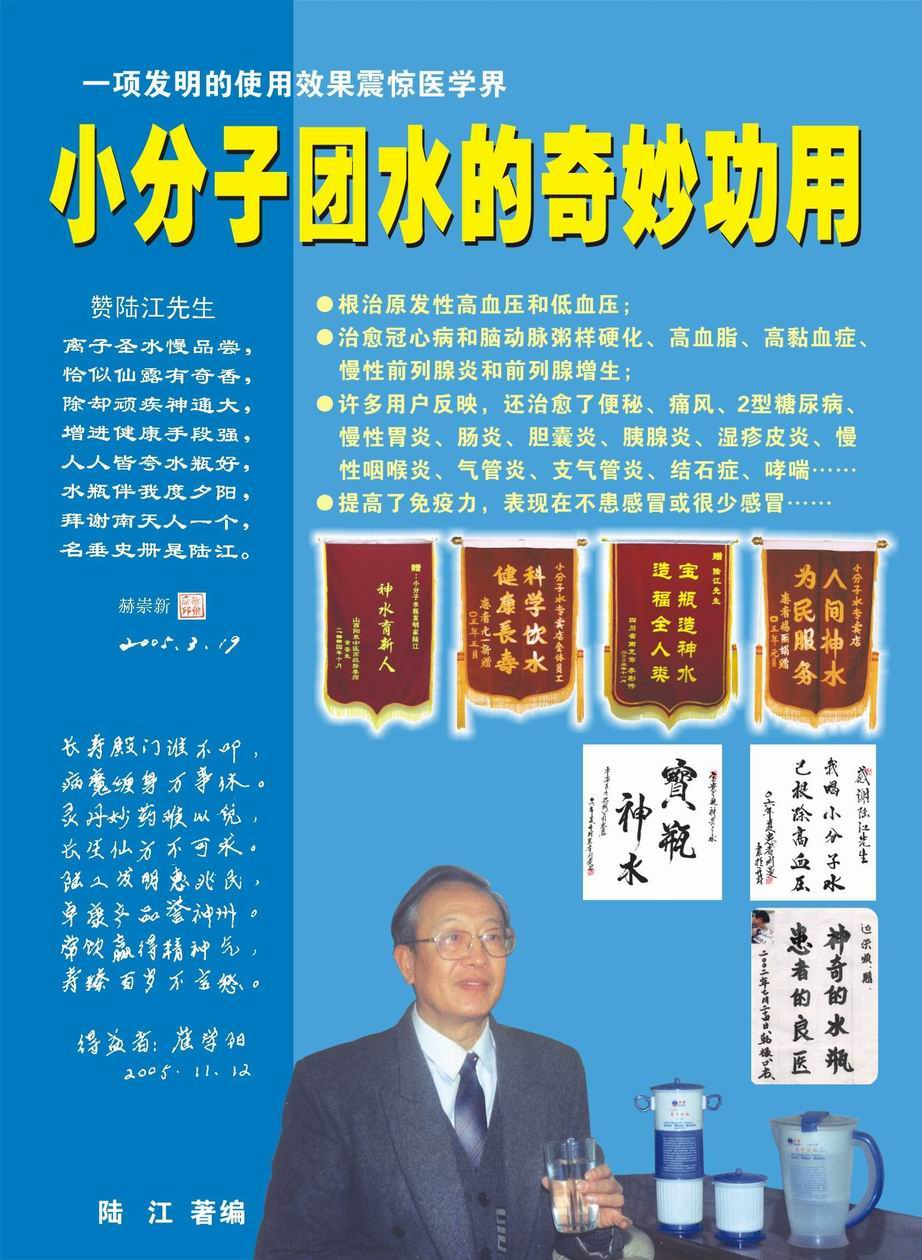 人類幾千年來(lái)患以上病癥需終生服藥,幾十年也不能治愈。可是我國(guó)南寧的高級(jí)工程師陸 江,于1990年想根治高血壓,研究發(fā)明了離子水瓶,處理出微小分子團(tuán)水供飲用,經(jīng)過(guò)醫(yī)院臨床試用和專家鑒定,1999年獲中國(guó)發(fā)明專利權(quán),產(chǎn)品于2000年投放市場(chǎng)后一直跟蹤調(diào)查,據(jù)全國(guó)各地用戶反饋:祛除了高低血壓、糖尿病和冠心病,并使前列腺增生、咽喉炎、鼻竇炎、慢性氣管炎、支氣管炎、矽肺病、哮喘、慢性胃炎、腸炎、慢性膽囊炎、慢性腎炎、腎衰、膀胱炎、便秘、痔瘡、風(fēng)濕性關(guān)節(jié)炎和濕疹皮炎及中風(fēng)后遺癥等病癥不藥而愈。為什么喝微小水能治20多種?。筷?nbsp;江從1991年德國(guó)科學(xué)家發(fā)現(xiàn)細(xì)胞膜水通道僅為2納米獲得啟發(fā),認(rèn)為多種器官患病是因細(xì)胞脫水,不能正常代謝和分裂增殖,才使器官細(xì)胞減少致衰弱萎縮而形成細(xì)胞缺水性病癥。22年來(lái)的實(shí)踐有力地支持了“細(xì)胞脫水致病”這一重要論點(diǎn),表明喝微小水可滿足細(xì)胞的生理需求,補(bǔ)水就能祛病,是生命科學(xué)新亮點(diǎn)。